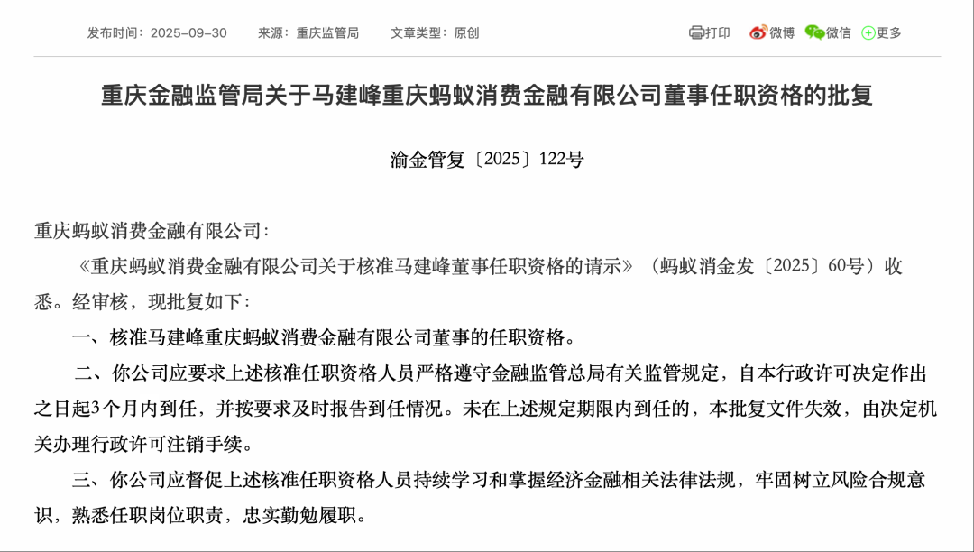 据《重庆蚂蚁消费金融有限公司关于核准马建峰董事任职资格的请示》(蚂蚁消金发〔2025〕60号)收悉。经审核,核准马建峰重庆蚂蚁消费金融有限公司董事的任职资格。