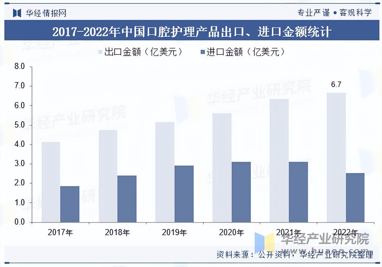 我国口腔护理产品出口金额随口腔行业快速发展逐年增长。数据显示,2022年我国口腔护理产品出口金额同增5.3%至6.7亿美元、净出口金额同比增长29%至4.2亿美元,出口规模持续扩大。