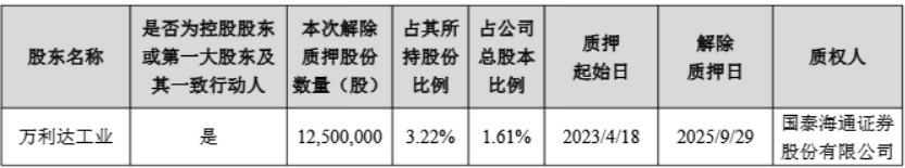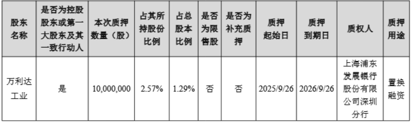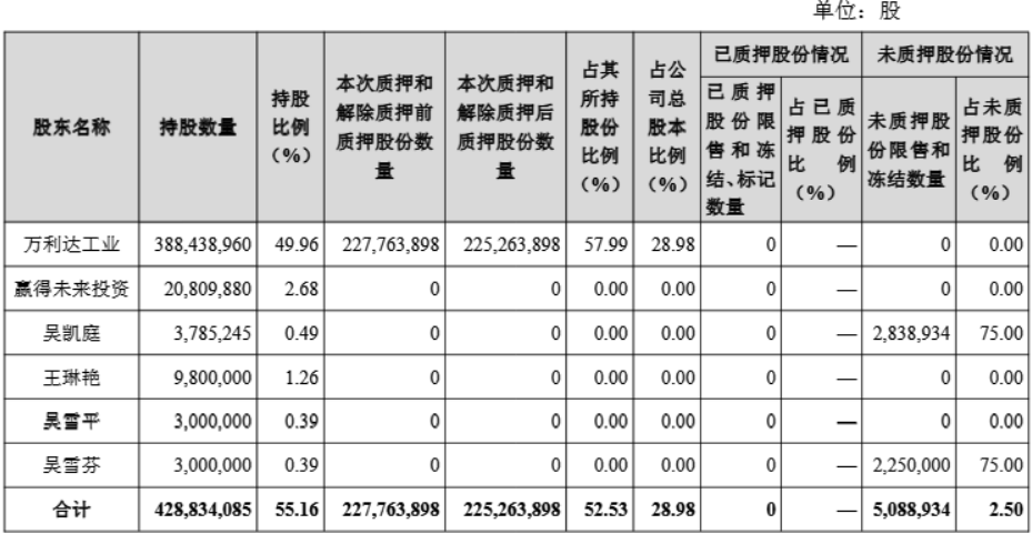 截至本公告披露日,万利达工业及其一致行动人所持股份质押情况如下: