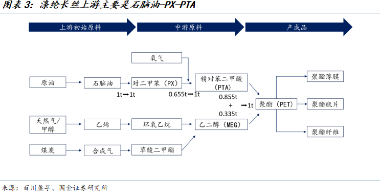 1.2涤纶长丝上游原材料主要有PX、PTA、MEG,下游应用于织造纺服行业