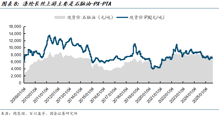 涤纶长丝产业链上游以原油裂解出的石脑油制PX,经氧化精制成PTA;同时乙烯路线或煤制路线产出MEG;中游将约0.855吨PTA+0.335吨MEG聚合得1吨PET熔体,采用连续聚合直纺生产POY/FDY/DTY等涤纶长丝,下游进入织造、染整与服装家纺等。需要注意的是,此处的原料消耗系数主要参考百川盈孚采用市场默认平均值,实际物料消耗情况会根据企业工艺路线优化和一体化规模效应有所变动。