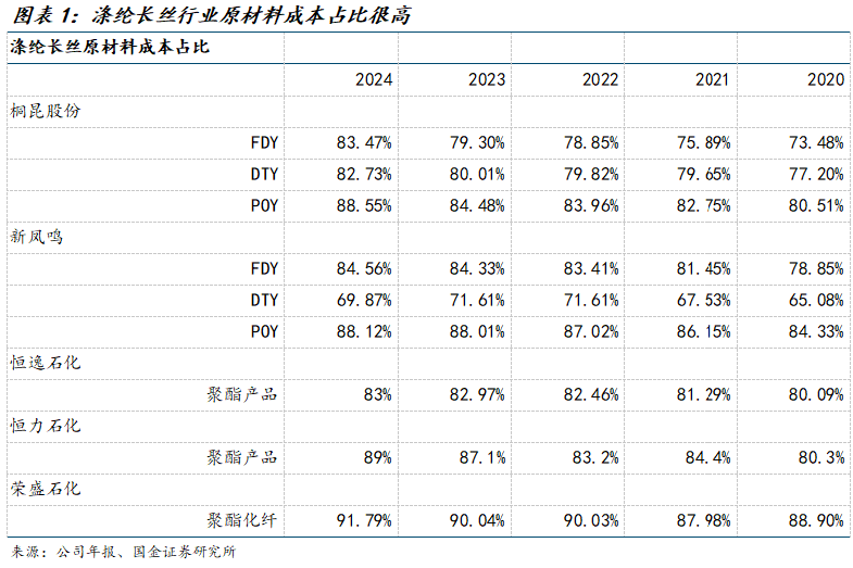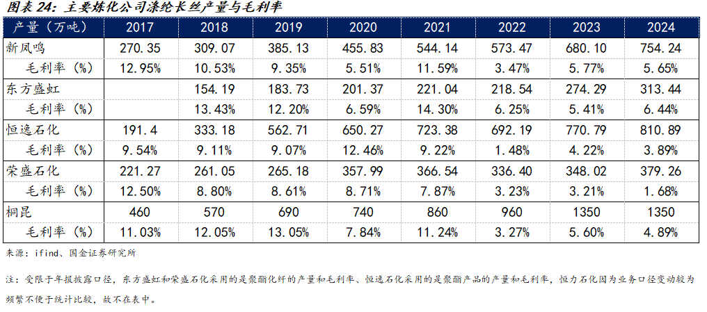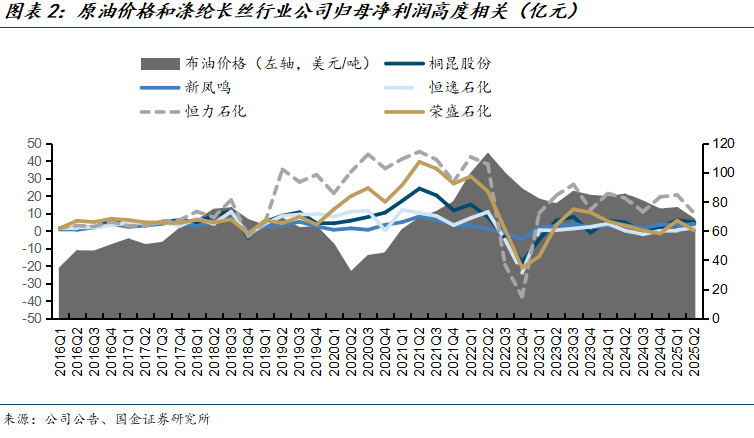 1、涤纶长丝产业链利润变动主要看供给侧投放节奏,综合来看行业短暂承压后将迎来拐点。从历史数据来看,涤纶长丝行业原材料成本占比基本均在70%以上,在极端原油价格行情下,主要公司归母利润会有较大波动,但从长期来看,产业链利润受中下游供需格局影响更大,尤其是供给侧产能投放节奏。根据百川盈孚,当前整个涤纶长丝25/26/27年产能增速为2.88%/4.92%/5.23%,并且上游PX、PTA、MEG均有较多计划产能,行业短期仍旧承压,但考虑到当前主要公司资本开支已经明显放缓,我们认为涤纶长丝行业短暂承压后将迎来拐点。现阶段具备规模成本优势,能够受益于产能出清行情的桐昆股份是当下最优选择。