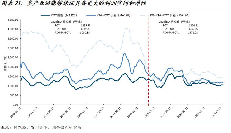 多产业链能够让企业具备更大的利润空间和增长弹性。在2020年之前PX-PTA-POY全链价差平均可以达到3080元/吨,是单POY价差的2.5倍,即使在2020年后各大民营龙头一体化炼化产能投放致使行业整体价差缩减,多产业链依旧具备更高的价差。另一方面,多产业链可平滑利润波动。例如,2022-2023年POY价差大幅回落至约1000元/吨附近,而全链价差仅短暂下滑一个季度后即回归常态区间,大大增强了企业的抗风险能力。