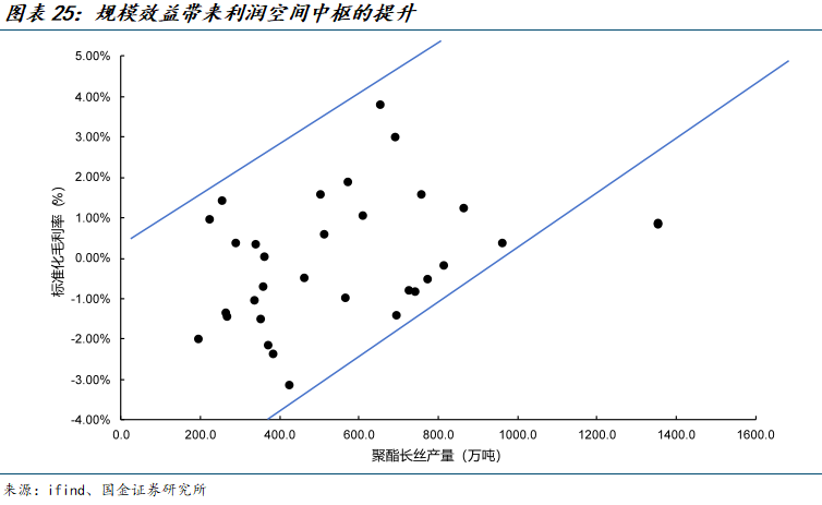 涤纶长丝行业的成本优势主要来源于规模效益和技术迭代带来的物耗能耗下降。头部公司通过一体化炼化装置用更优的能耗物耗形成单位成本优势,体现在更高、更稳定的毛利率上。从实际数据来看,桐昆作为涤纶长丝产能第一的龙头企业,拥有行业中上水平毛利率,为了更加直观地展示规模效益带来的优势,我们将企业毛利率按照年度平均值进行标准化,明显发现涤纶长丝产量和市场毛利率中枢呈正相关关系。