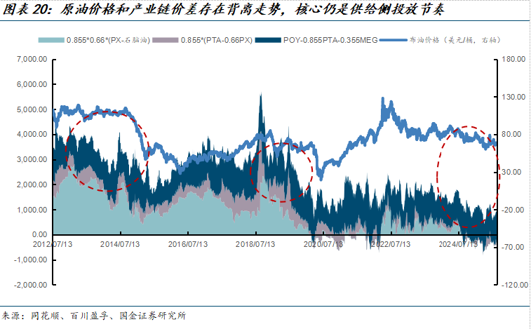 我们认为相较于原油价格扰动,产业链利润最大的影响因素为行业基本面供需格局。具体来讲,涤纶产业链价差和油价存在阶段性背离走势,即便在原油相对平稳的时期(如2012–2014年、2018–2020年以及2023年至今),产业链价差仍显著走弱,其根本原因在于供给侧的集中扩张,民营大炼化与一体化项目在芳烃/PX、PTA至长丝等多个环节密集投产带来的阶段性过剩。相较于原油价格这一成本锚,决定产业链利润的关键在于中下游供需格局与产能投放节奏。考虑到当前整个涤纶长丝产业链未来仍有较多产能投放,我们认为涤纶行业短期仍将承压,涤纶长丝的大级别行情取决于是否有老旧产能出清和行业协同涨价。