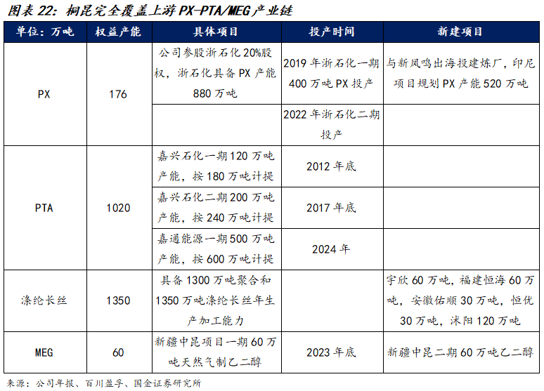 截至2024年末,桐昆已经实现了产业链全覆盖。当前桐昆具备1300万吨聚合和1350万吨涤纶长丝年生产加工能力。PX方面,公司参股浙石化20%股权,间接具备PX产能。PTA方面,公司在2012年后陆续投产PTA产能,当前产能1020万吨,基本满足PTA原料需求。MEG方面,公司中昆项目2*60万吨天然气制乙二醇项目一期60万吨已经投产。