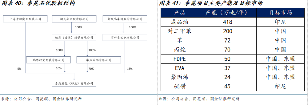 桐昆联合新凤鸣出海,打开东南亚市场机会。2023年6月份,桐昆发公告启动泰昆石化炼化一体化项目,该项目包括1600万吨/年炼油产能,对二甲苯产能520万吨/年,乙烯80万吨/年,主要用于补充印尼国内炼油产能,其余的化工原料和产品运回中国供中国专业企业进行深度加工生产高附加值产品,预计建设年限4年。考虑到大规模资金出境的审批风险和国际国内政治经济形式的变化,公司于2024年5月发布公告进行调整,投资金额从86亿美元降至40亿美元,项目规模调整为1000万吨/年炼油,对二甲苯产能200万吨/年,乙烯120万吨/年,股权结构也进行了相应调整。项目建成后,预计可实现年均营业收入74亿美元,年均税后利润5.2亿美元,税后财务内部收益率11.39%,税后投资回收期10.31年。
