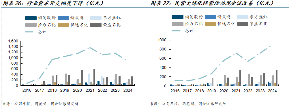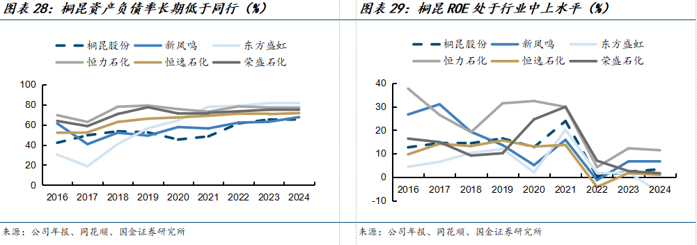 即使现在仍然有新建产能规划,但涤纶长丝产业链扩产大趋势已经开始收紧,未来供给端不会出现与过去十年近似的产能高速增长情形。随着资本开支的下降,企业未来有更多现金流用于分红回购、降杠杆以及拓展新方向。从同业对比中来看,桐昆资产负债率长期优于同行,并且ROE一直处于行业中上游水平,这意味着桐昆在自由现金流改善阶段具备相对更强的资本配置与穿越周期能力。