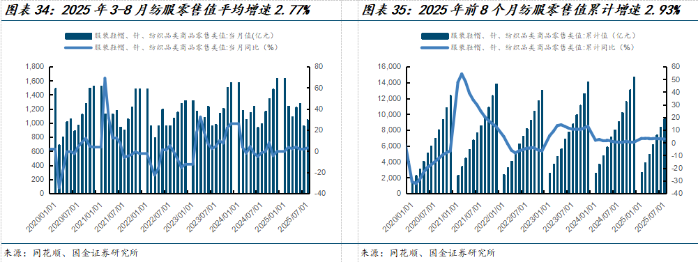 从生产和投资端来看,国内纺织服装行业整体稳中向好。从投资端来看,由于纺织企业稳步扩大高端化、智能化、绿色化转型升级投入,根据国家统计局数据,2024年1-12月国内纺织服装、鞋、帽制造业固定资产投资实际完成额累计同比增长18.0%。从生产端来看,国内纺织服装生产企业收入和利润呈现稳中有增的态势,根据国家统计局数据,2024年国内纺织服装、服饰业规模以上工业企业营业收入约为1.26万亿元,同比增长2.8%,该增长态势一直持续到2025年上半年;2024年实现利润总额623.8亿元,同比增长1.5%,但到2025年前7个月累计利润下降幅度为-14.58%,平均下降幅度为-11.58%:投资方面,2024年国内纺织服装、服饰业规模以上工业增加值累计同比增长0.8%,2025年依旧较为稳定。