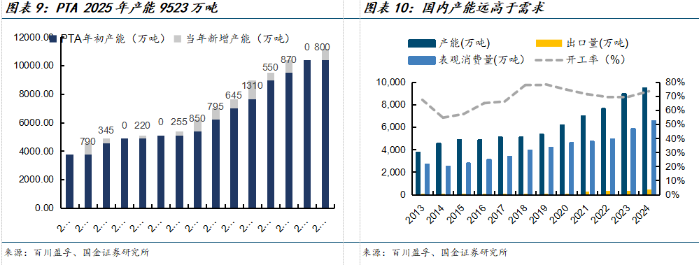 PTA2024年产能达到9523万吨,而表观需求量只有6557万吨,开工率为73.48%。根据百川盈孚,过去12年PTA平均每年产能增加524万吨,平均增速9%,略高于需求平均增速8%。未来预计还有1170万吨产能的增量,到2027年整体PTA产能将达到亿吨级别。此外,为了消化国内过剩产能,2022年后国内PTA出口量开始增加,2021年出口增速高达204%,2022-2024保持平均20%增速。