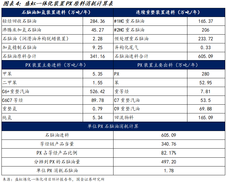 以盛虹炼化于2018年披露的炼化一体化环评报告书中PX装置的进料出料表为例。按全链口径计算,将进入连续重整的重石脑油视为芳烃链的唯一源头投入,分母取重整入口石脑油总量605.09万吨/年,此处不考虑PX装置内部的中间物流如重整汽油和C6C7芳烃。随后,按对外可计价的终端芳烃产品质量当量对石脑油投入进行分摊,具体以PX、苯和重芳烃的产量280.00、52.95和7.81万吨/年计算PX占比份额为82.17%,并据此计算石脑油归属到PX的量为605.09×0.822≈497.4万吨/年,进而得到PX的单位石脑油单耗为497.4/280.0≈1.78吨/吨。该算法仅计算了物料消耗,从经济价值角度还需要考虑流程副产物经济价值,此处仅为说明PX物料消耗实际情况会根据工艺和规模效益有所区别,行业简化测算常以1:1投料当量近似判断PX价差位置,PTA、PET亦同逻辑。