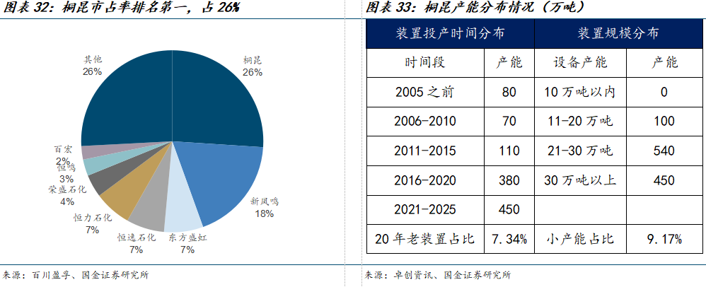 3、老旧产能和小规模装置因性价比存在出清风险,桐昆将因此受益。根据卓创资讯,装置投产时长超过20年的老旧产能有634万吨,占比12.95%,如果老旧产能全部出清,供给侧压力将得到有效缓解;从另一个角度来看,由于规模效应确实能带来较为明显的利润优势,小产能装置也有替换和出清的可能,当前设计产能20万吨以内的装置产能总计1401.2万吨,占比达30%。相比之下,桐昆20年老旧装置产能占比为7.34%,小产能占比为9.17%,均远低于行业平均水平,在出清行情中会有更大的收入弹性。