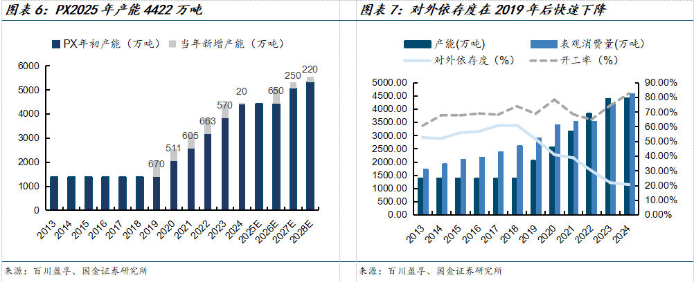 PX对外依存度大幅降低,国内供给处于过剩状态。根据百川盈孚,2018年中国PX产能为1383万吨,对外依存度高达60%,2019年后国内大量投放PX产能,6年内新增3039万吨,到2025年达到4422万吨,完全能够满足国内市场需求,对外依存度降至20%。未来2026-2027年分别还有650/250/220万吨新投放产能,价格下行压力较大。