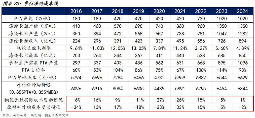 从另一方面来讲,对于上游产业链的覆盖能够实现相关材料自主可控,稳定公司整体生产和经营活动,平滑涤纶长丝生产成本曲线。我们拆分了桐昆过去10年的长丝单吨成本,观察到桐昆涤纶长丝实际成本波动远低于原材料外购成本。通过覆盖上游产业链,桐昆有效降低原材料价格波动对生产经营的影响,从而实现更稳定的运营。