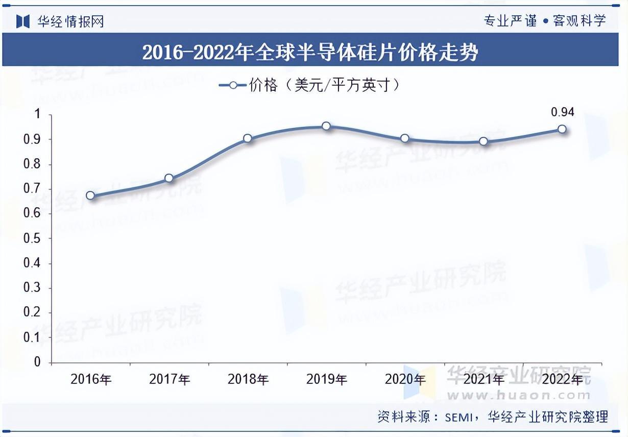 半导体产品各种终端应用装置种类与数量不断扩展,不但推动了各式半导体产品市场需求增长,同时带动了半导体制造设备与材料需求。2017年开始硅片价格进入上升通道,于2019年达到0.95美元/平方英寸的高点;伴随下游持续旺盛,2022年硅片价格继续上涨,达到0.94美元/平方英寸。