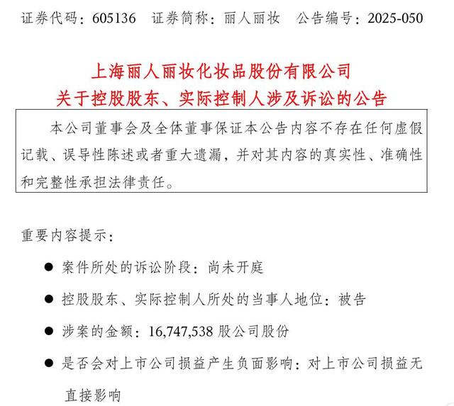 9月30日,上海丽人丽妆化妆品股份有限公司(605136 SH,以下简称“丽人丽妆”)发布公告,控股股东、实际控制人黄韬因涉及离婚后的财产纠纷,收到上海市徐汇区人民法院的举证通知书及应诉通知书。据悉,前妻翁淑华请求将登记在黄韬名下的公司股份中的16747538股过户至子女黄逸琪名下。