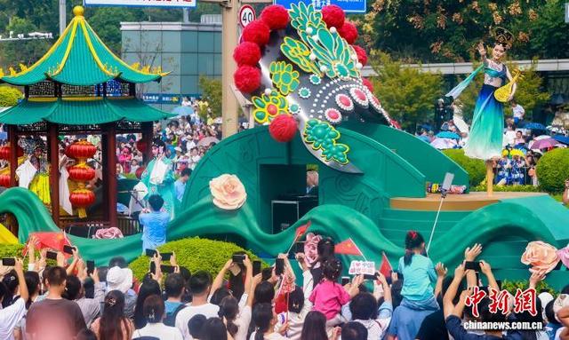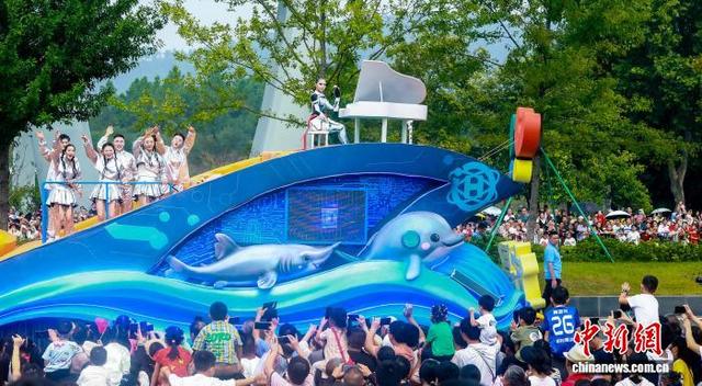 10月1日,2025“河山添锦绣——文旅IP城市大巡游”在武汉东湖高新区(又称“中国光谷”)举行。23台花车、38家国内外演艺团队联袂呈献视听盛宴,与武汉市民、游客共同庆祝中华人民共和国成立76周年。图为市民与游客观看造型独特的花车。中新社记者 张畅 摄