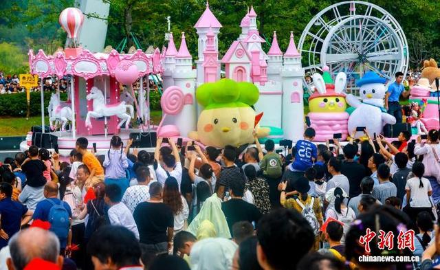 10月1日,2025“河山添锦绣——文旅IP城市大巡游”在武汉东湖高新区(又称“中国光谷”)举行。23台花车、38家国内外演艺团队联袂呈献视听盛宴,与武汉市民、游客共同庆祝中华人民共和国成立76周年。图为巡游花车上武汉IP“蒜鸟”吸引市民与游客观看。中新社记者 张畅 摄