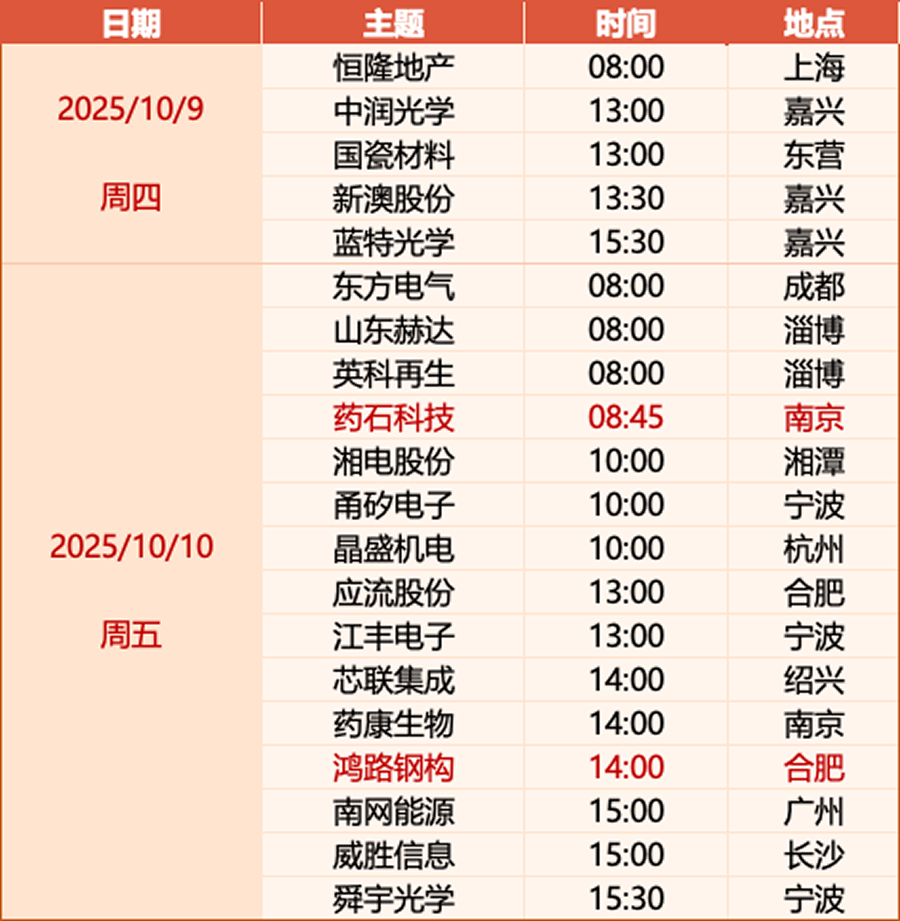 本周调研呈现明显的区域集中性,长三角地区为核心调研区域。10月9日,浙江嘉兴集中迎来中润光学、新澳股份、蓝特光学3家企业调研,成为当日区域调研焦点;10月10日,长三角多地调研活跃度攀升,浙江宁波有甬矽电子、江丰电子、舜宇光学3家企业,安徽合肥覆盖应流股份、鸿路钢构2家企业,江苏南京则有药石科技、药康生物参与调研,浙江绍兴的芯联集成、杭州的晶盛机电也同步开展调研。