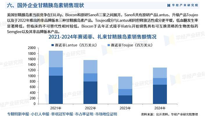 对三代胰岛素而言,外资厂商在以前占据绝对的主导地位,最近几年其市场份额明显下降,但仍然占据主要的市场地位。国产胰岛素在最近几年的突进速度比较快。2024年国产胰岛素市场份额预计达到55%。从国内甘精胰岛素市场份额来看,赛诺菲以54.57%市场份额位居首位。目前我国甘精胰岛素市场竞争格局正经历从外资主导到国产企业崛起的深刻变化,未来发展潜力巨大。