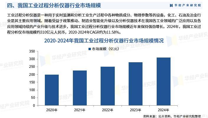 工业过程分析仪器是一种用于实时监测和分析工业生产过程中各种物质成分、物理参数等的设备,化工、石油及冶金行业是其主要应用领域。随着受益于政策推动、制造业智能化升级以及分析仪器技术在我国各工业领域的广泛应用以及各应用领域持续的产业升级与技术进步,我国工业过程分析仪器行业市场规模近年来保持强劲增长。2024年,我国工业过程分析仪市场规模约310亿元人民币,2020-2024年CAGR约为11.58%。