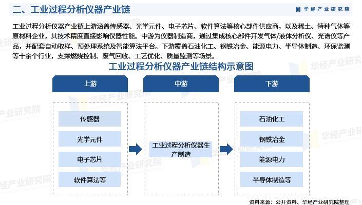 工业过程分析仪器产业链上游涵盖传感器、光学元件、电子芯片、软件算法等核心部件供应商,以及稀土、特种气体等原材料企业,其技术精度直接影响仪器性能。中游为仪器制造商,通过集成核心部件开发气体/液体分析仪、光谱仪等产品,并配套自动取样、预处理系统及智能算法平台。下游覆盖石油化工、钢铁冶金、能源电力、半导体制造、环保监测等十余个行业,支撑燃烧控制、废气回收、工艺优化、质量监测等场景。