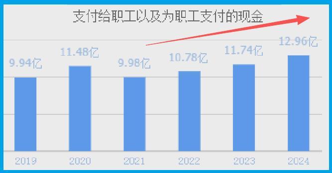 从2022年开始,公司每年为员工支付的薪酬已经连续三年实现了增长,并在2024年以12.96亿元创出了历史新高。这一数据看似和公司的业绩没有直接关系,但实际上却有着千丝万缕的联系。
