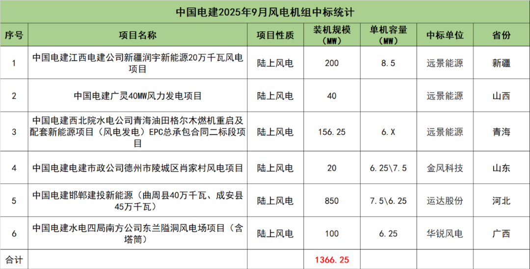 中国电建开标项目共6个,总装机规模为1366.25MW,由远景能源、金风科技、运达股份、华锐风电4家整机商中标。