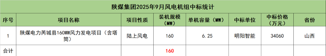 陕煤集团开标项目共1个,总装机规模为160MW,由明阳智能1家整机商中标。