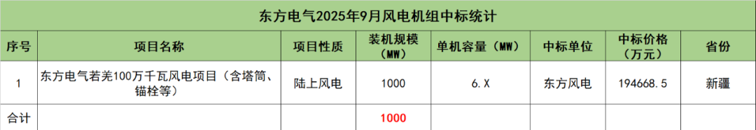 东方电气开标项目共1个,总装机规模为1000MW,由东方风电1家整机商中标。