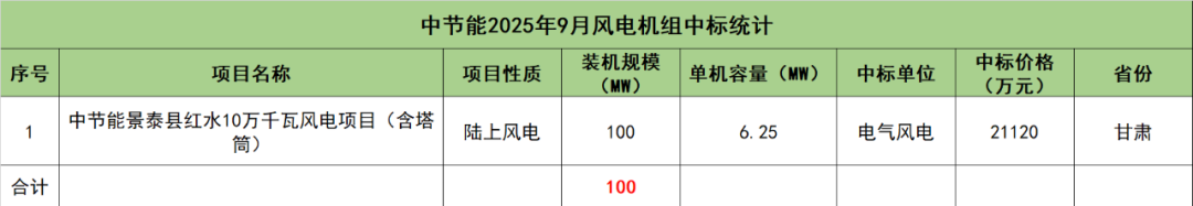 中节能开标项目共1个,总装机规模为100MW,由电气风电1家整机商中标。