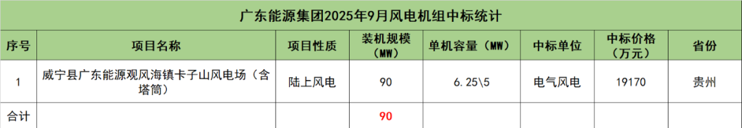 广东能源集团开标项目共1个,总装机规模为90MW,由电气风电1家整机商中标。
