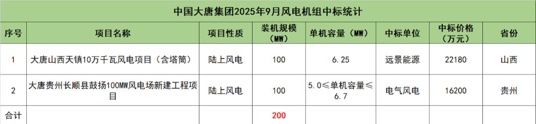 中国大唐集团开标项目共2个,总装机规模为200MW,由远景能源、电气风电2家整机商中标。
