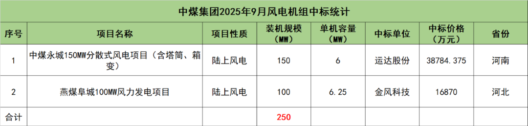 中煤集团开标项目共2个,总装机规模为250MW,由运达股份、金风科技2家整机商中标。