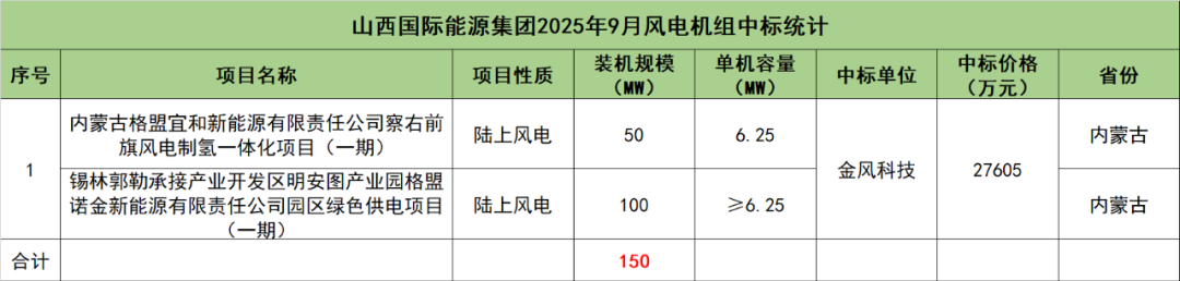 山西国际能源集团开标项目共1个,总装机规模为150MW,由金风科技1家整机商中标。