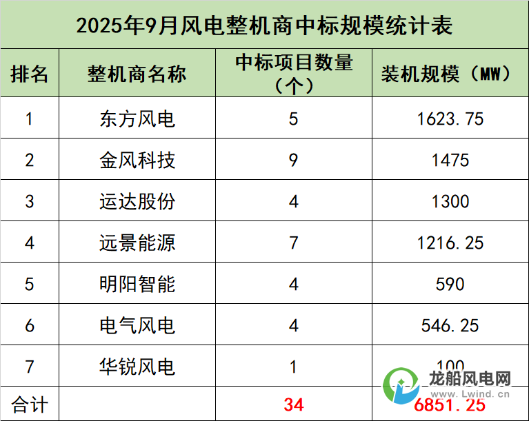 2025年9月份,风电项目开标总装机容量共计6851.25MW,共有7家整机商中标,其中东方风电、金风科技、运达股份中标规模位居前三。