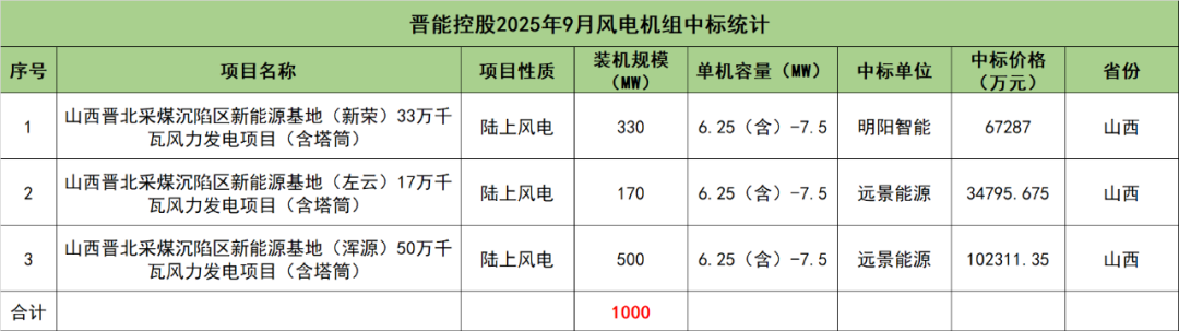 晋能控股开标项目共3个,总装机规模为1000MW,由明阳智能、远景能源2家整机商中标。