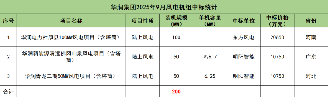 华润集团开标项目共3个,总装机规模为200MW,由东方风电、明阳智能2家整机商中标。