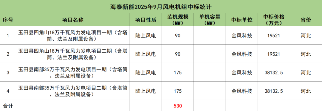 海泰新能开标项目共4个,总装机规模为530MW,由金风科技1家整机商中标。