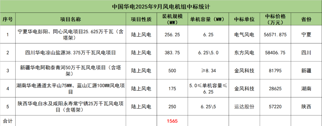 中国华电开标项目共5个,总装机规模为1565MW,由电气风电、东方风电、金风科技、运达股份4家整机商中标。