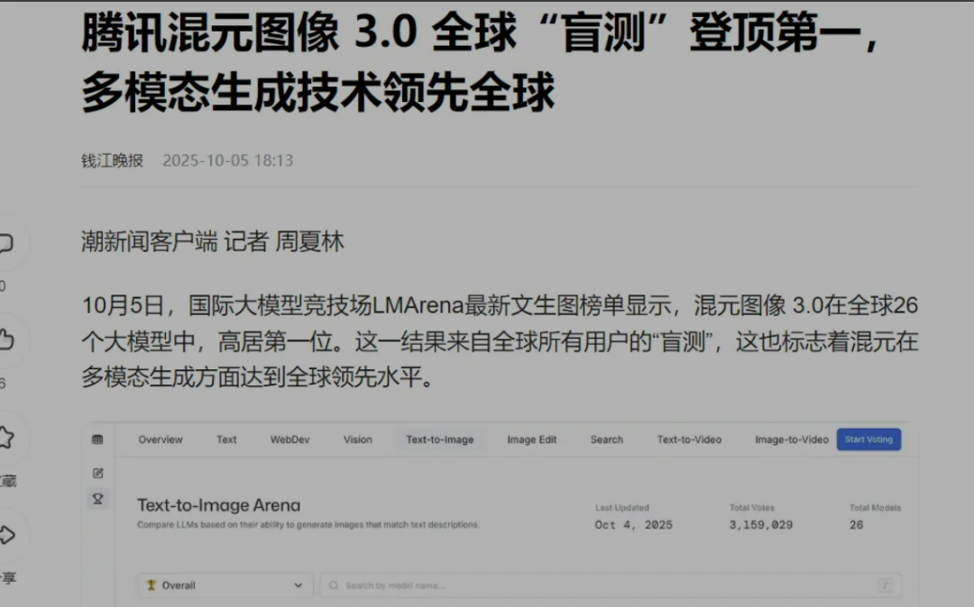 国产大模型假期也有突破:腾讯混元图像 3.0 全球“盲测”登顶第一,多模态生成技术领先全球