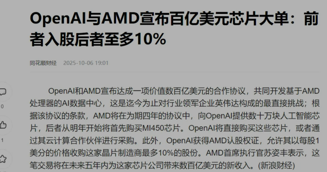 7、AMD与OpenAI达成重磅合作:股价暴涨24% 市值增加4500亿