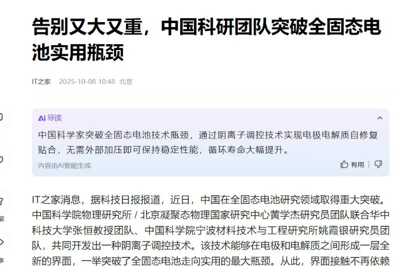 中国科研团队突破全固态电池实用瓶颈
