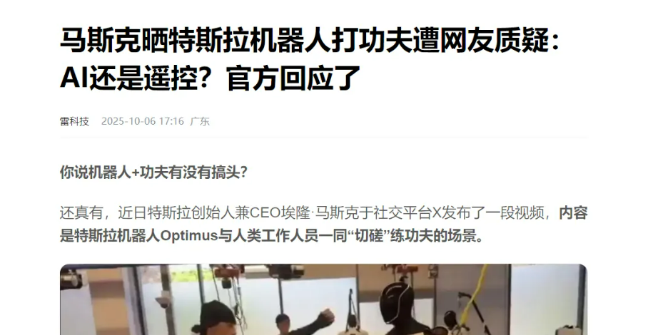 马斯克晒特斯拉机器人打功夫 “用的是AI,并非遥控操作。”