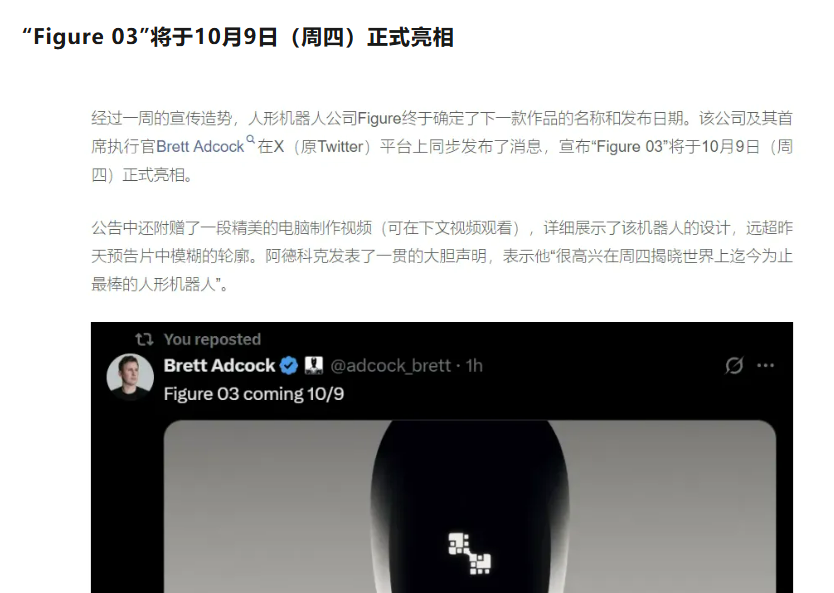“Figure 03”将于10月9日(周四)正式亮相