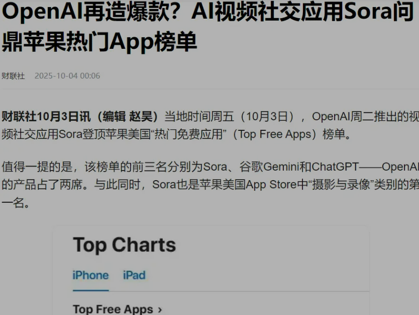 OpenAI再造爆款?AI视频社交应用Sora问鼎苹果热门App榜单