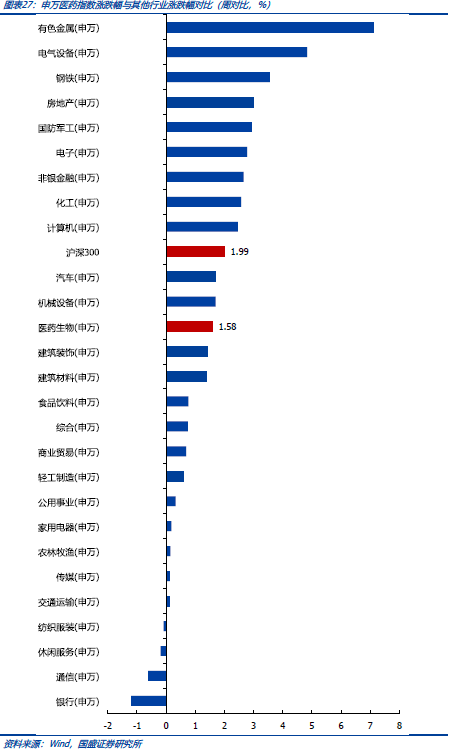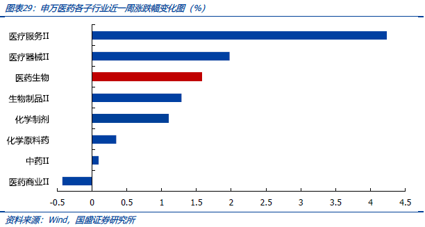 子行业方面,9.29-10.7表现最好的为医疗服务,环比+4.23%;表现最差的为医药商业II,环比-0.42%。