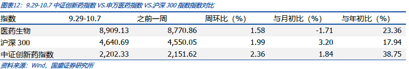 过去两周(9.29-10.7)中证创新药指数周环比2.36%,跑赢医药指数,跑赢沪深300指数。截至10月7日,中证创新药指数2,202.33点。申万医药指数周环比1.58%,沪深300指数周环比1.99%。