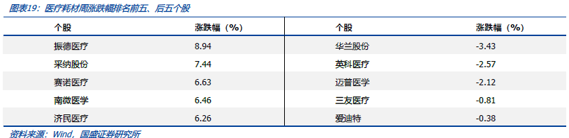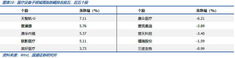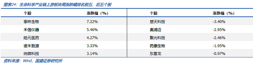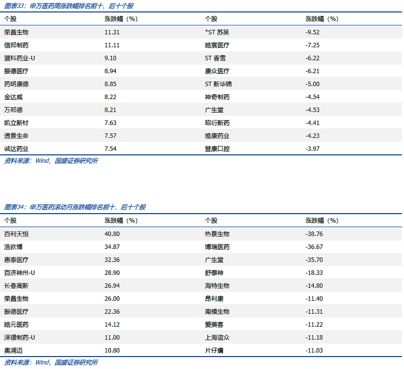 9.29-10.7涨跌幅排名前5为荣昌生物、信邦制药、盟科药业-U、振德医疗、药明康德。后5为*ST苏吴(维权)、皓宸医疗、ST香雪、康众医疗、ST新华锦(维权)。