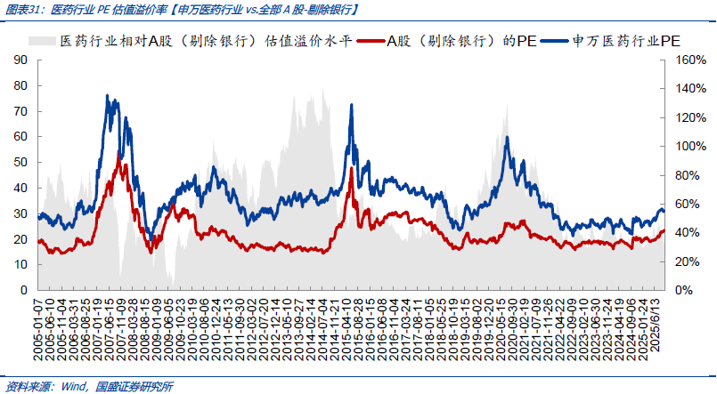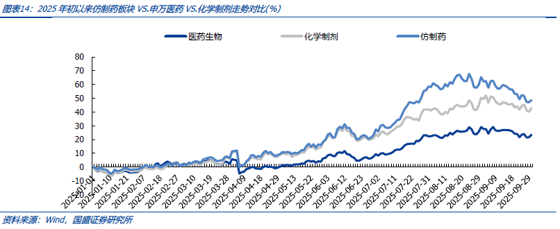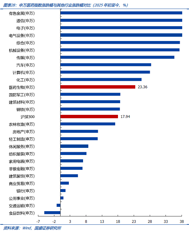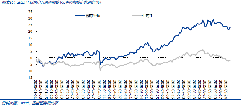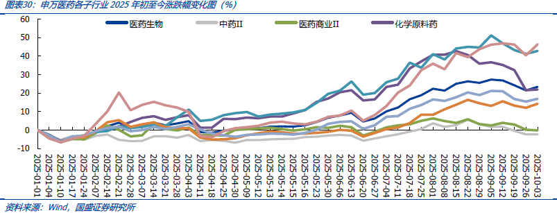 化学制剂年度涨跌幅行业内领先。2025年初至今表现最好的子行业为医疗服务,上涨46.30%;表现最差的为中药II,下跌2.28%。其他子行业中,化学制剂上涨42.74%,医药商业II下跌0.25%,化学原料药上涨21.89%,医疗器械II上涨14.23%,生物制品II上涨16.86%。